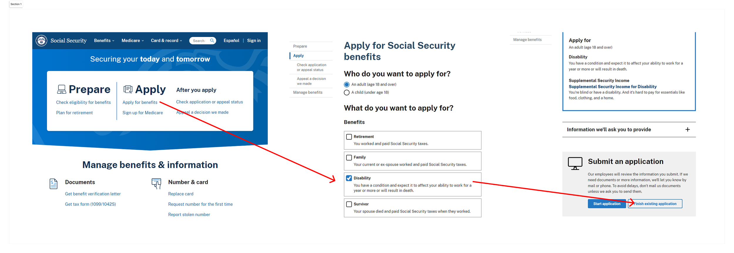 If a user saved their application and attempted to resume at a later time from the agency home screen, there was no clear path to pick up where they left off. They would have to click “Apply for benefits,” reselect the benefit for which they were applying, then would see a secondary button allowing them to “Finish existing application.” Before they would get to that point, our usability participants assumed there was no way to restart. Frustration would boil over to the point they would abandon their online application and call the 1-800 number, or restart an application altogether.